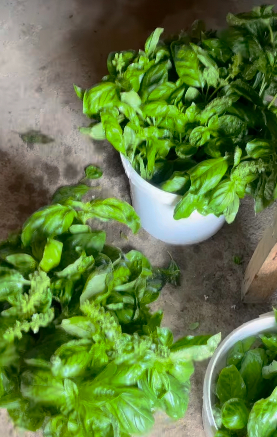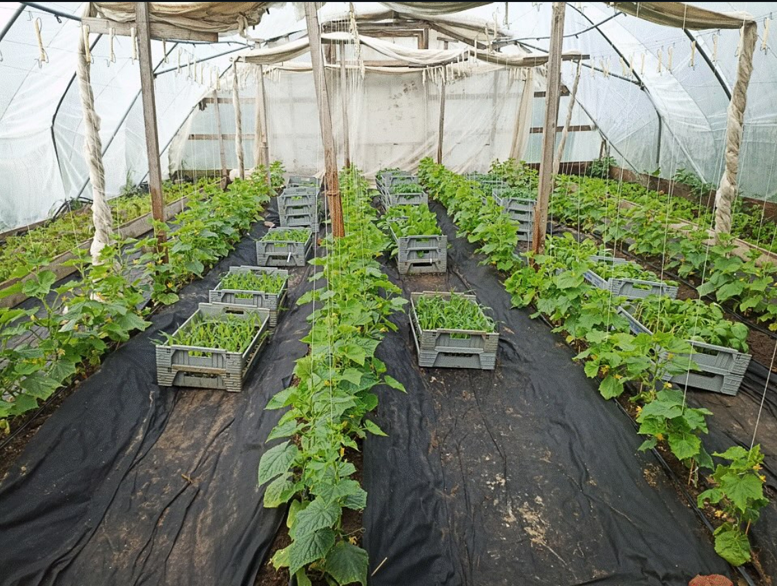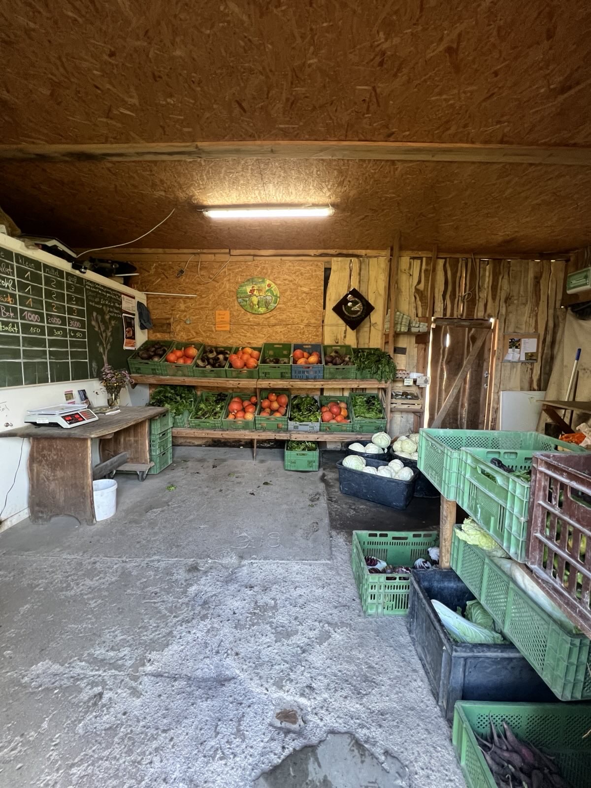Es gibt eine Halle, in der sich der Abholraum, eine Gemüsewaschstation, zwei Kühlhäuser, ein Brotbackofen und Lagerräumde befinden.